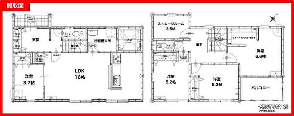 南東向き、2階建の4SLDKの間取りです♪広々とした洗面脱衣室や収納スペースがついており、ご家族でとても使い勝手の良い間取りとなっております♪