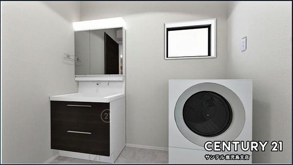 (同仕様モデル)洗面脱衣所!窓の付いた清潔感のあるシンプルな洗面脱衣所♪洗面台は、三面鏡の裏も収納スペースが付いており、シャワーヘッド付き!※家具、家電、インテリアはCGによるイメージです。