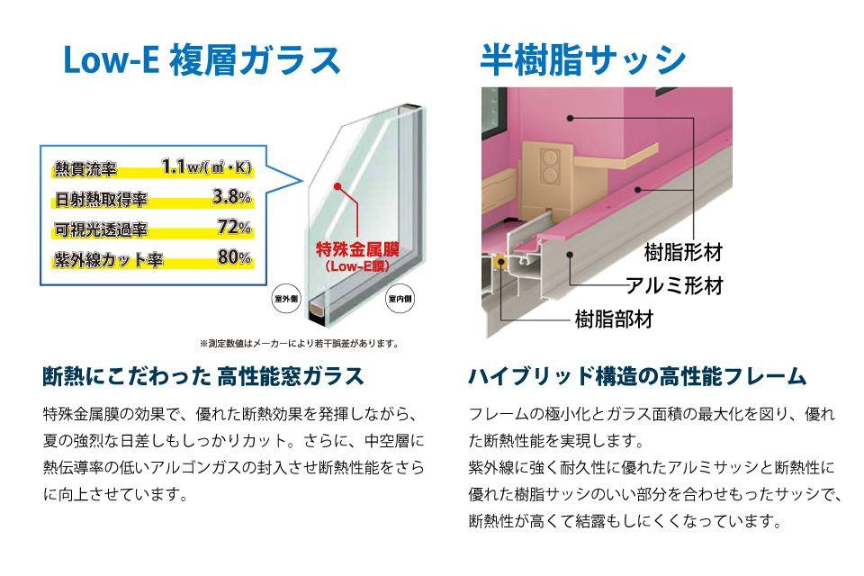・Low-E複層ガラスガラスにコーティングされた特殊金属膜。(Low-E膜)により、高い断熱効果を発揮。エアコンの冷気、暖気を逃がさず、効率を高めて住まいの省エネ化に貢献し、快適な室内環境を実現します。・半樹脂サッシ外側には耐候性が高く劣化しにくいアルミ、内側には断熱性能の優れた樹脂を使用したサッシです。アルミは長持ちし、樹脂は夏に外の熱を遮断し冬には室内の熱を保持します。