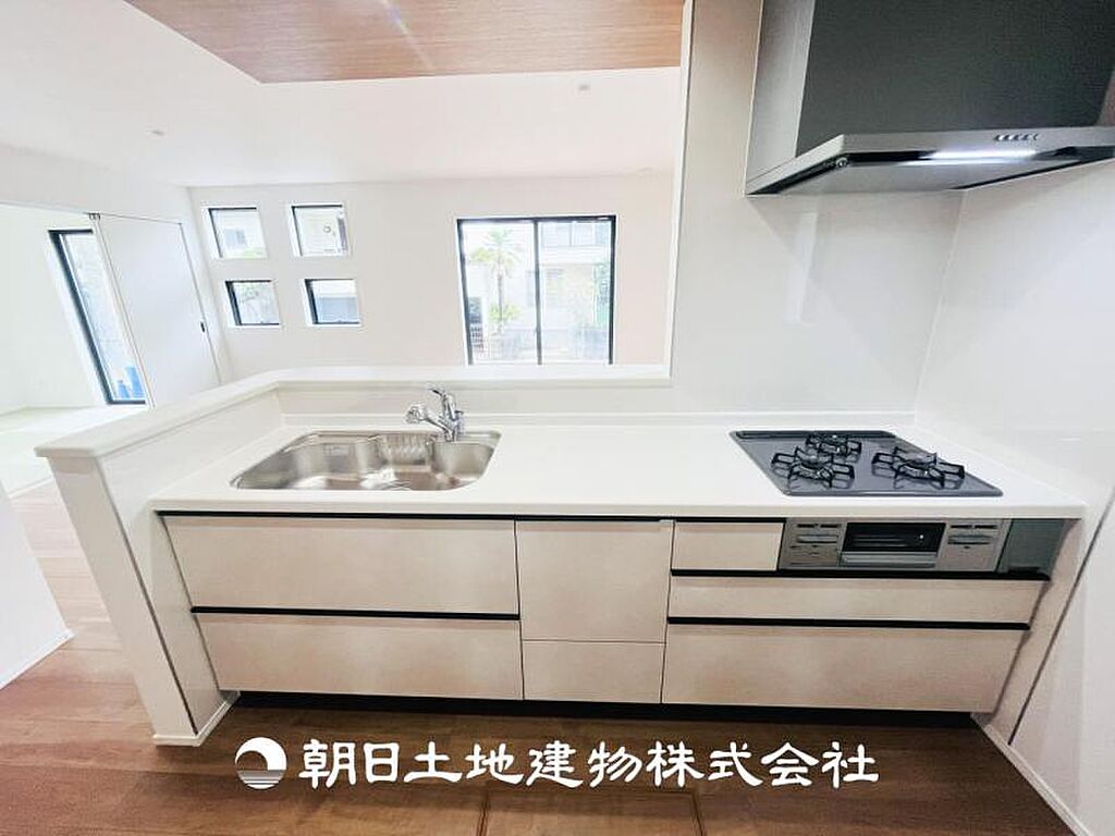 【システムキッチン】対面式のワイドタイプのキッチンになります♪皆さんと会話を楽しみながらお料理をできたりお子様と一緒にお料理を楽しめるスペースがあるのは嬉しいですよね♪