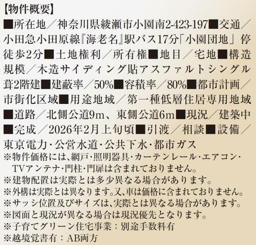 | 物件名 | 神奈川県綾瀬市小園南2丁目の新築売戸建住宅 | ||||