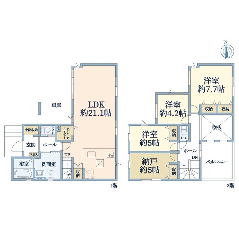 設備 | LDK20畳以上 / 陽当り良好 / 対面式キッチン / トイレ2ヶ所 / 2階建 / 床下収納 / 浴室に窓 / 吹抜け / ウォークインクローゼット / 都市ガス / 納戸 | ||||