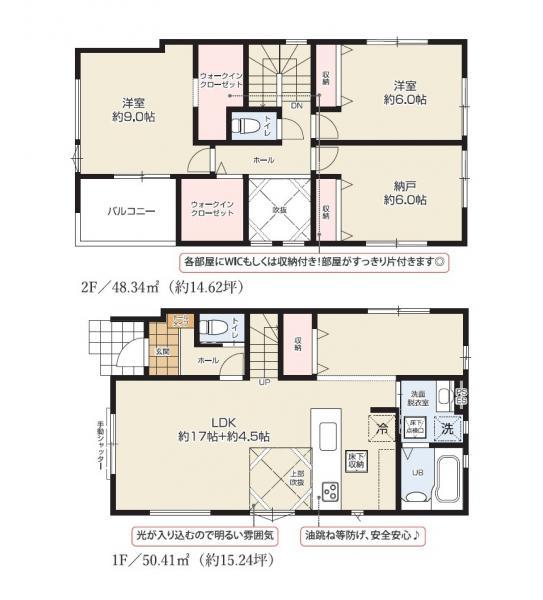 | 設備 | フラット35・S適合証明書 / 地盤調査済 / 駐車2台可 / 即引渡可 / 2沿線以上利用可 / LDK20畳以上 / スーパー 徒歩10分以内 / 市街地が近い / システムキッチン / 浴室乾燥機 / 陽当り良好 / 全居室収納 / 駅まで平坦 / 整形地 / シャワー付洗面化粧台 / 対面式キッチン / トイレ2ヶ所 / 浴室1坪以上 / 2階建 / 南面バルコニー / 複層ガラス / オートバス / 温水洗浄便座 / 床下収納 / 浴室に窓 / 吹抜け / TVモニタ付インターホン / 通風良好 / 全居室フローリング / ウォークインクローゼット / リビング階段 / 都市ガス / 全室2面採光 / 小学校 徒歩10分以内 / 平坦地 / 納戸 / 食器洗乾燥機 / 周辺交通量少なめ / 隣家との間隔が大きい / 浄水器 | ||||