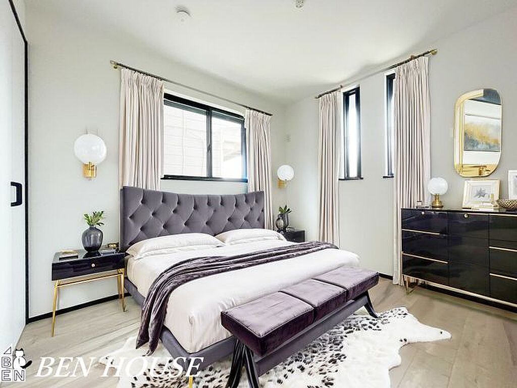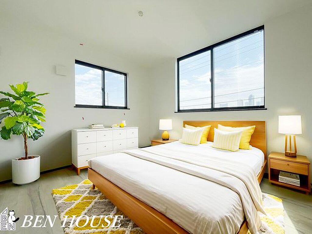 寝室・主寝室です。窓が大きく明るい広々とした主寝室のため、ご家族でゆっくりお休みになれますね。