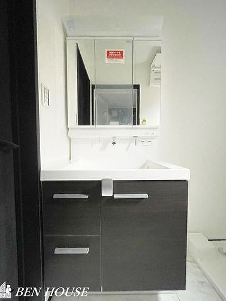 洗面化粧台・収納たっぷりで身だしなみチェックに便利な三面鏡付き洗面化粧台。