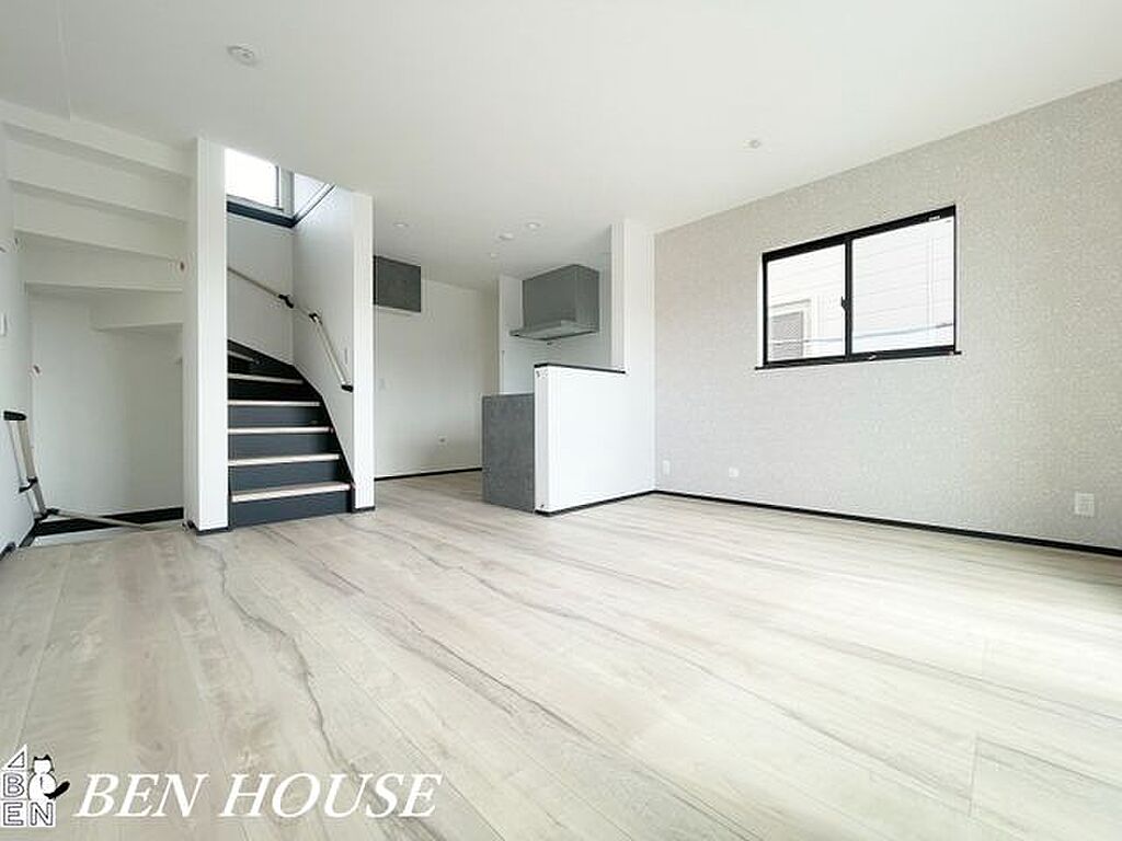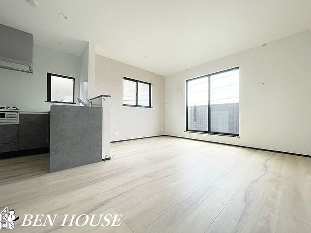 リビング・対面キッチンで一体感のあるLDK。たくさんの窓から入り込む太陽光で明るく開放感のある大空間となっています。