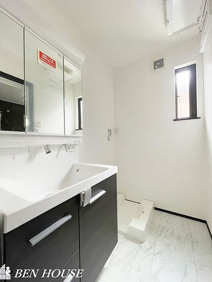 洗面脱衣室・収納力があり、機能的な三面鏡付き洗面化粧台を設置した、ゆとりある広さの洗面脱衣室です。