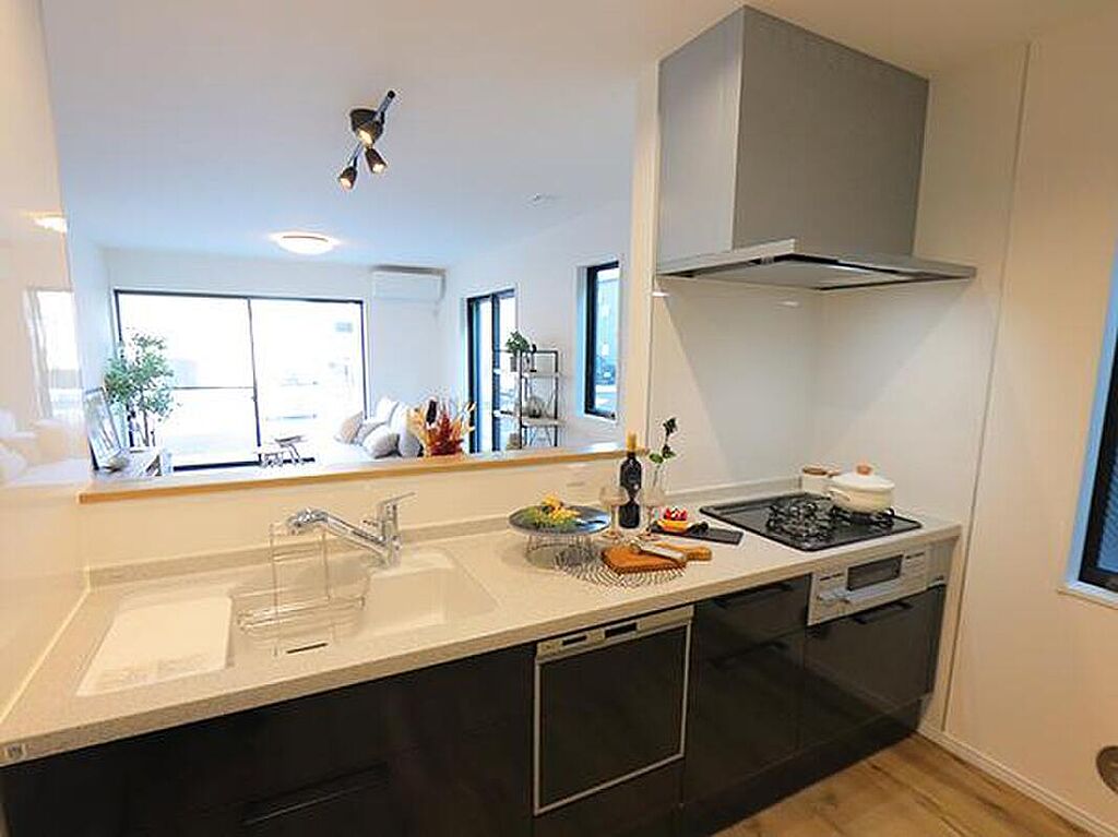 ◆シックで高級感のあるシステムキッチン家族とのコミュニケーションを取りながらお料理が楽しめる人気の対面キッチン。パントリーには食材のまとめ買いや、非常用グッズなどしまって頂けます。