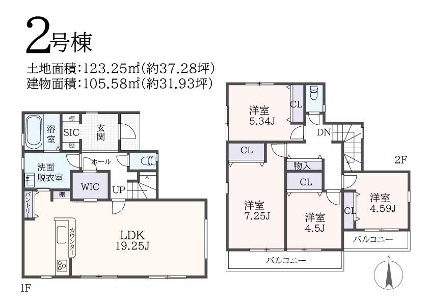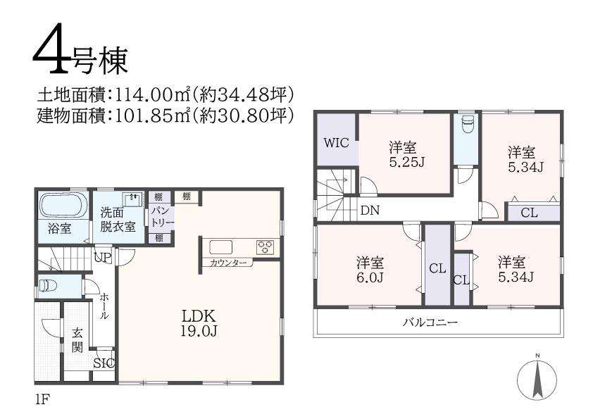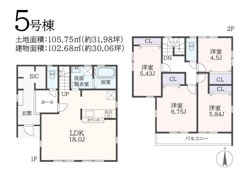 | 建物面積 | 101.85㎡~105.99㎡(30.80坪~32.06坪)(実測) | 土地面積 | 105.75㎡~145.13㎡(31.98坪~43.90坪)(実測) | ||