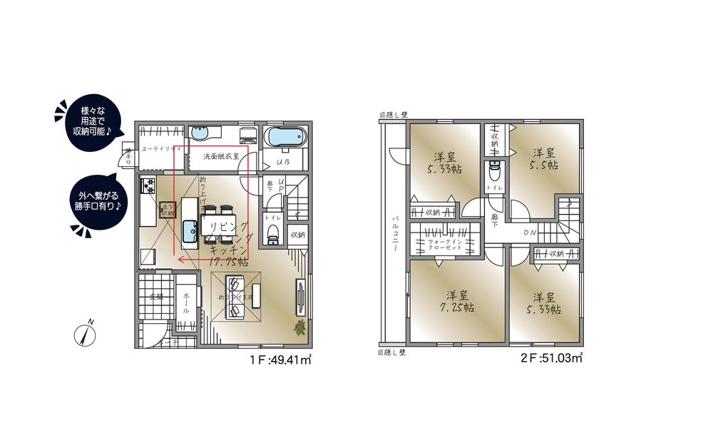 ※土地(建築条件なし)で「建物プラン例」が表記してある時、そのプラン例は特定の建築請負会社によるもので、当該建築請負会社以外で建てた場合、同様のものが同価格で建てられるとは限りません。また建築請負会社を特定するものではありません。