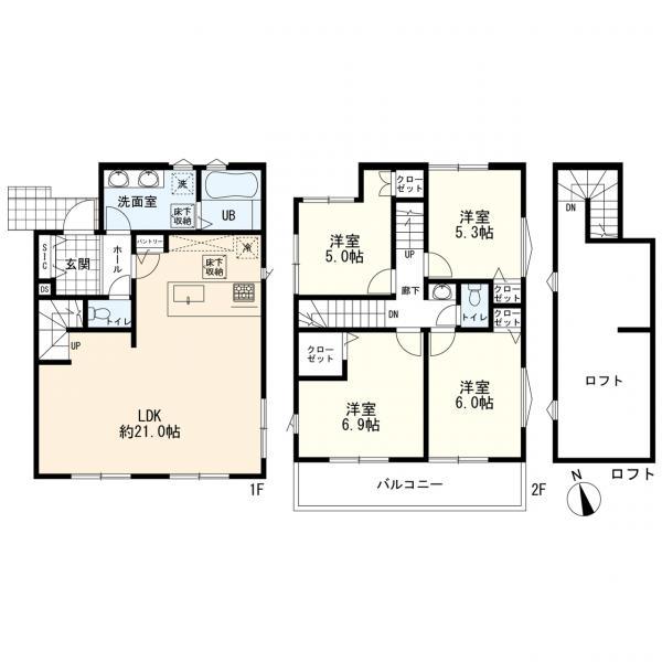 | 設備 | 2沿線以上利用可 / LDK18畳以上 / システムキッチン / 陽当り良好 / 全居室収納 / 総合病院 徒歩10分以内 / 整形地 / 対面式キッチン / トイレ2ヶ所 / 浴室1坪以上 / 2階建 / ロフト / 浴室に窓 / 通風良好 / ウォークインクローゼット / リビング階段 / 都市ガス / シューズインクローク / 全室2面採光 / ルーフバルコニー | ||||