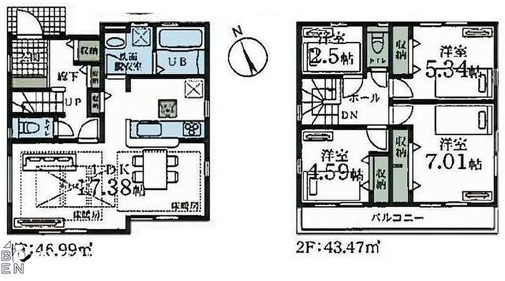 間取図(2号棟)・カースペースにて駐車2台可能・廊下収納や床下収納など充実の収納・水回り設備が集約されており家事負担軽減になります・床暖房標準設置のリビングで足元から暖めてくれます