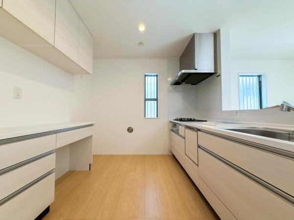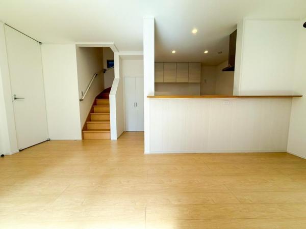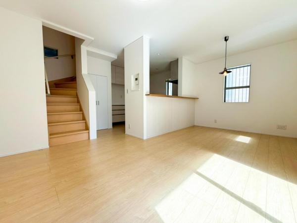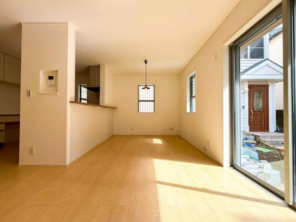 お天気が晴れの日は照明をつけなくても充分明るいリビングです!どこか落ち着きのある広々とした内装です!皆で過ごす空間が、目に浮かんでくる様な優しいリビングダイニングです!くつろいだり楽しい時間を是非!