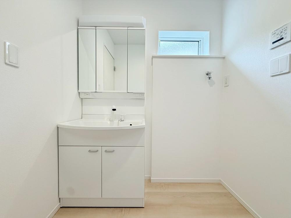 ☆Wash Stand☆(1号棟)使い勝手の良いサニタリースぺース。毎朝の身支度も、陽の光差し込む明るい空間で、快適にお使い頂けます。三面鏡裏に収納スペースも確保しているのでいつでもスッキリ♪