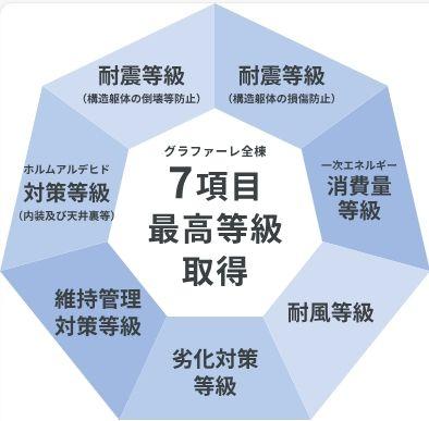グラファーレの住まいは、国が定める住宅性能表示制度の中でも防災性や耐久性、環境性能やメンテナンス性など特に重要な7項目で最高等級を取得。お客様に永く安心して暮らせる住まいを提供するため、タクトホーム一丸となって品質向上に努めてまいります。