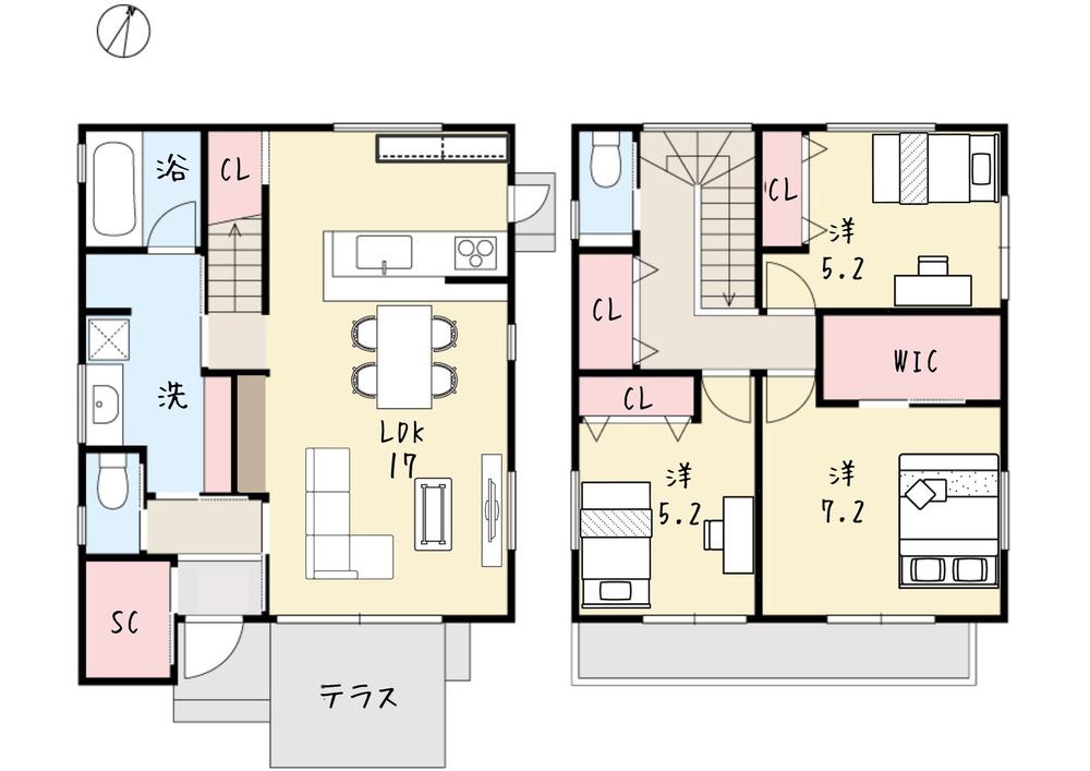 | 設備 | 駐車2台可 / 南向き / システムキッチン / 陽当り良好 / 全居室収納 / LDK15畳以上 / 2階建 / 南面バルコニー / TVモニタ付インターホン / ウォークインクローゼット / シューズインクローク / テラス | ||||