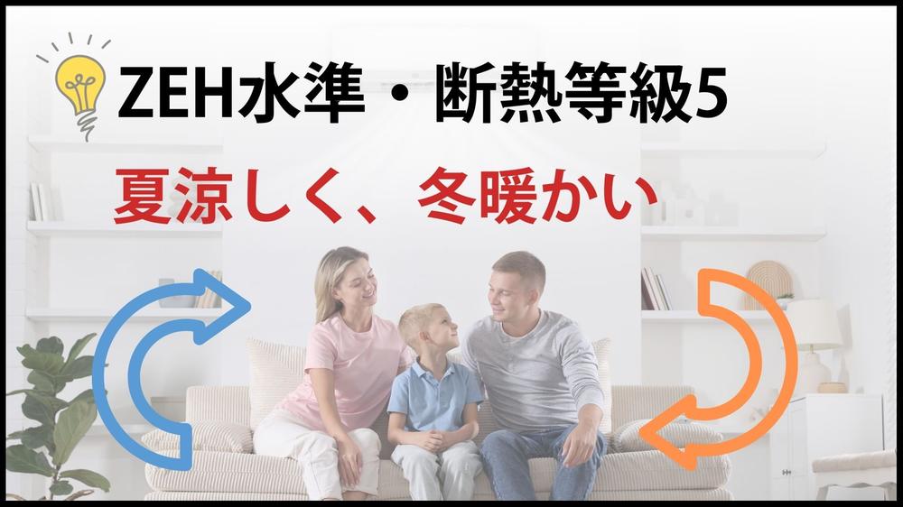 【光熱費を抑えるZEH水準】 断熱等級5の高性能な「夏涼しく冬暖かい家」。外気の影響を受けにくいため冷暖房効率が良いです。高騰する電気代を節約しつつ、部屋ごとの温度差が少ない快適で健康的な暮らしを♪