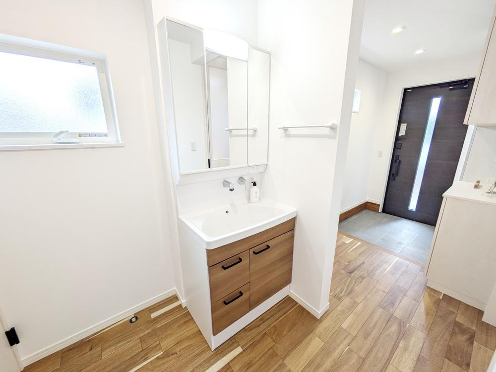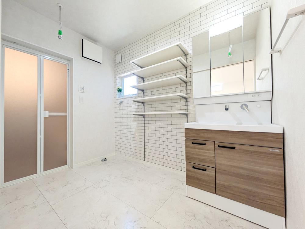 【1号地:洗面脱衣室】3帖の広々脱衣室。洗濯機横のスペースに棚板を設置しています。棚板にはタオルを置いたり、箱を並べて収納するなど、オリジナルの方法で見栄えよく収納スペースを作ることができます。