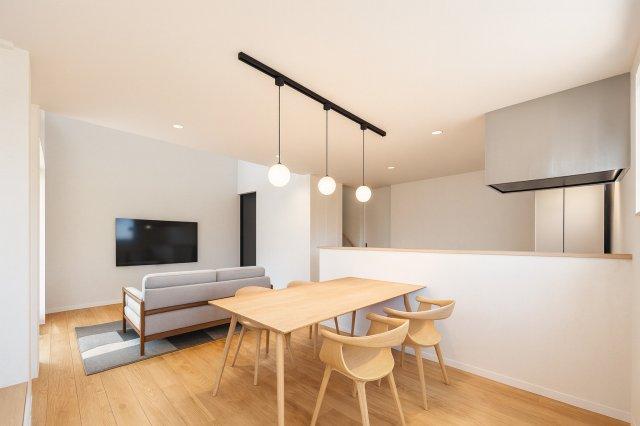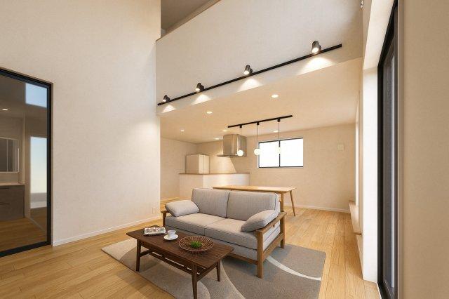 おしゃれな空間を演出する吹抜が心地よいのびのびとした居室空間の建売です。