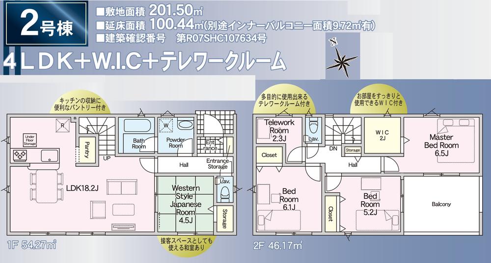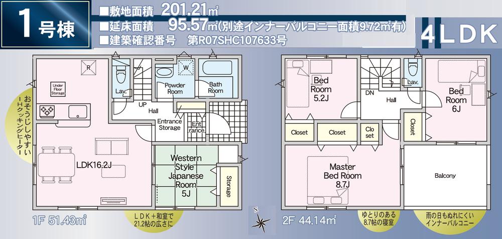 | 建物面積 | 95.57㎡・100.44㎡(28.90坪・30.38坪) | 土地面積 | 201.21㎡・201.5㎡(60.86坪・60.95坪) | ||