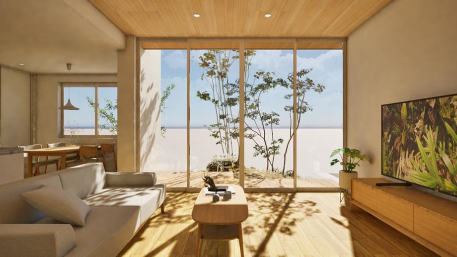 開放感のある角地。リビングのハイサッシを開けると、内と外が繋がり一体的な空間として利用できます。