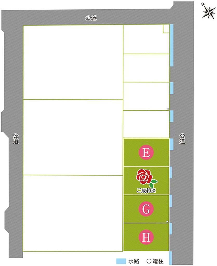 | 建物面積 | - | 土地面積 | 189.00m2(E号地)、188.99m2(G号地)、187.78m2(H号地) 私道負担なし | ||