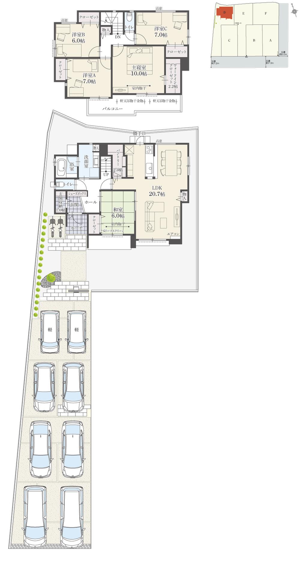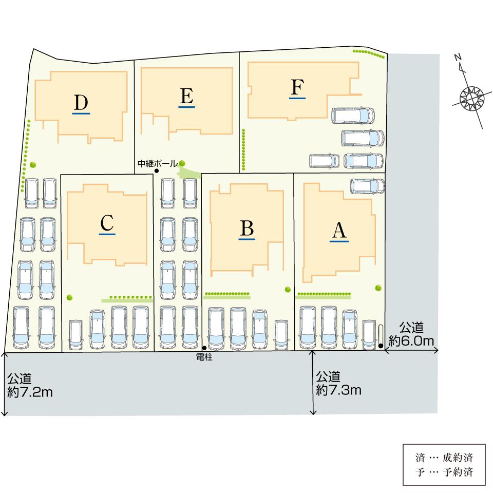 | 地目 | 宅地 | 道路付け | 道路幅:6m~7.3m、アスファルト舗装、延長敷地部分:D棟113.51㎡、E棟111.85㎡(各々敷地面積に含む) | ||