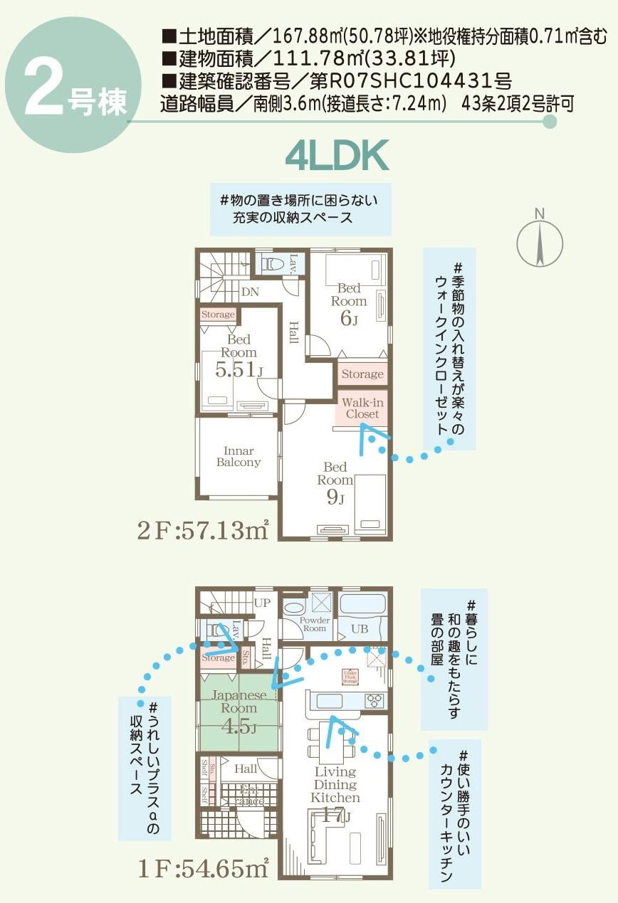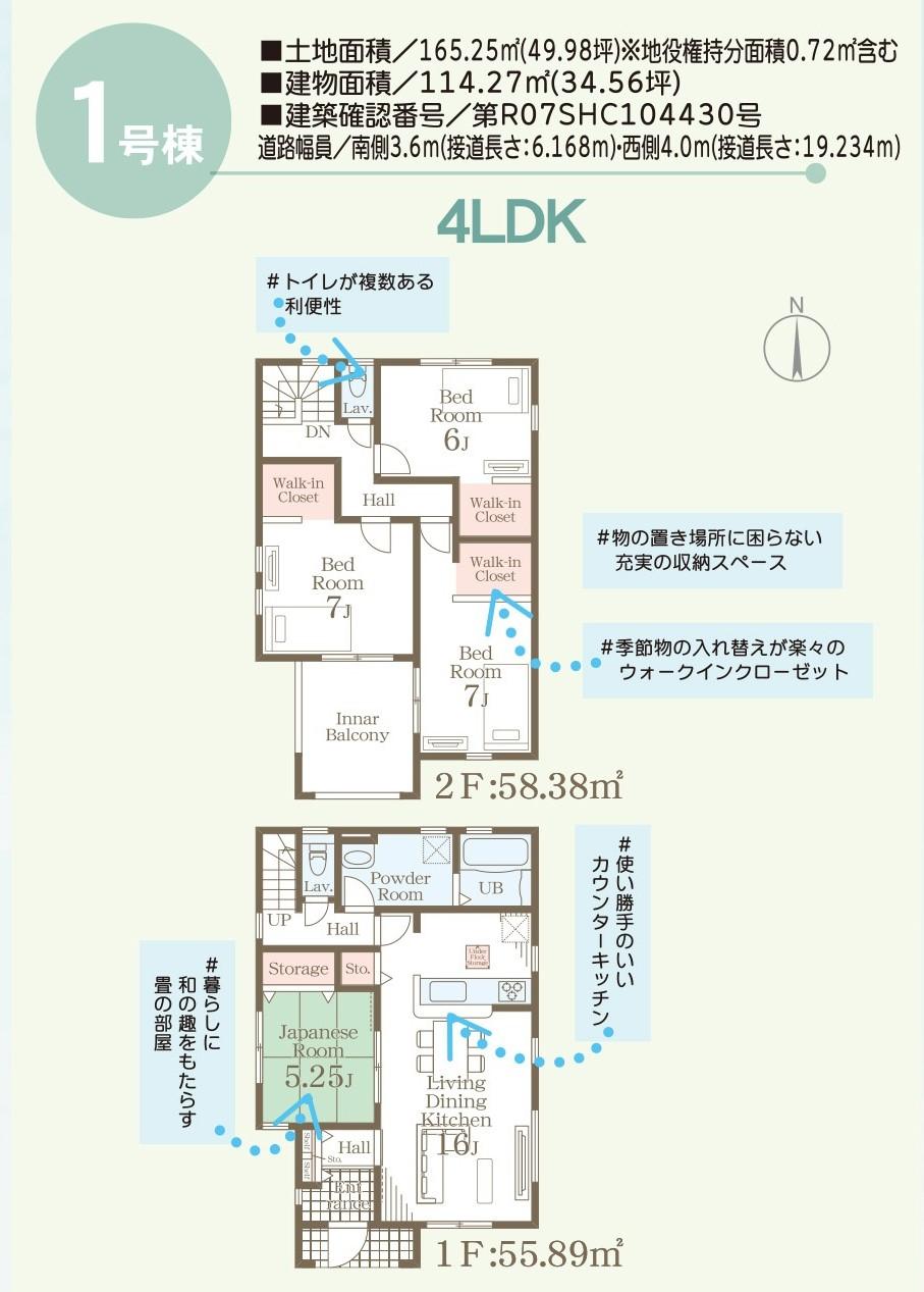 | 建物面積 | 111.78㎡・114.27㎡(33.81坪・34.56坪)(登記) | 土地面積 | 165.25㎡・167.28㎡(49.98坪・50.60坪)(登記) | ||