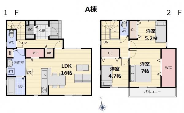 間取り4LDK【間取り紹介】 ◎フリーコーナー有(1号棟)◎18.2帖のゆとりあるリビング(2号棟)◎家事動線が楽になる洗面収納有(1号棟)◎便利な廊下収納付き(2号棟)◎主寝室は8.2帖と広々!(1号棟)