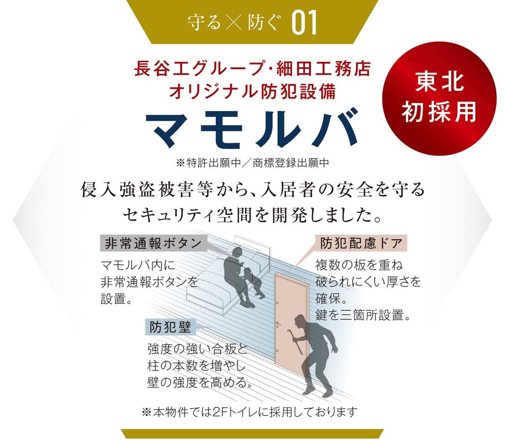 侵入強盗被害等から、入居者の安全を守るセキュリティ空間。「防犯配慮ドア」×「防犯配慮壁」×「非常通報ボタン」の3つのポイントで大切な家族を守ります。(※ブランシエラガーデンめでしまの郷では2Fトイレに採用されています。)