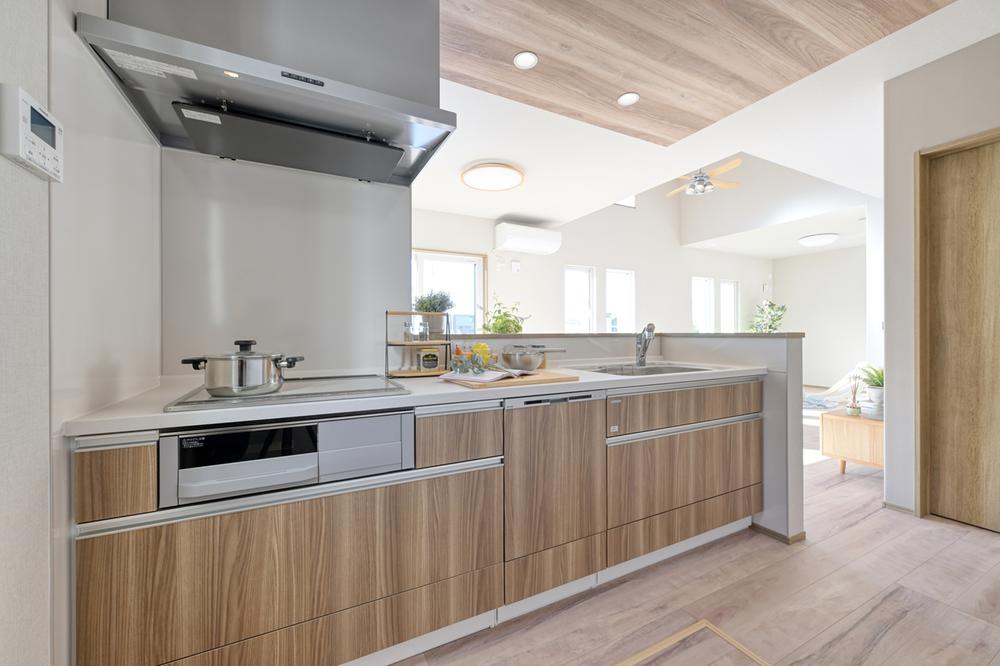 サッと拭くだけで汚れがすぐに取れる、お手入れ簡単なホーロークリーンパネルが特徴の広々キッチンスペース。ビルトイン食洗器付で家事負担の軽減・時短にもなりますね。(現地モデルハウス 2025年11月撮影)
