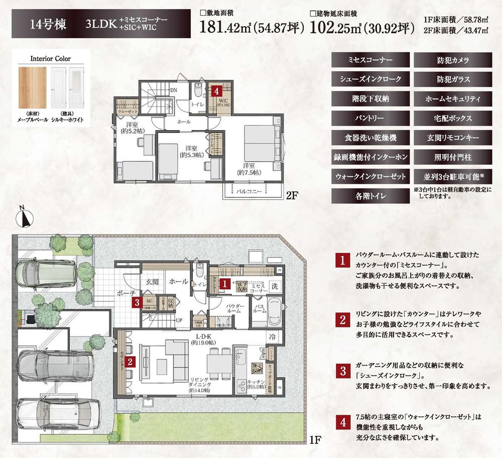 | 販売スケジュール | ボーナス払い0円で毎月8万円台~更に!◆2月までのご契約で住宅に必要なエアコンなどのオプションを50万円分サービスのお得なチャンス!※オプションサービス項目など詳しくはお問合せください。【安心の設備】◇防犯カメラ防犯カメラ完備!お子様が居るご家庭も安心して過ごせる住まいです。◇防犯ガラス割れにくい素材のガラスなので空き巣対策になります。◇ホームセキュリティ「外出中」はもちろん、「在宅中」「就寝中」も安全を見守るサービスが搭載。◇マモルバ住まいの中に「防犯配慮ドア」と「防犯壁」に囲まれた空間を設置。【POINT】◇セキュリティに特化した住宅で、小さなお子様が居ても安心の生活をご提案。◇駐車スペース全棟3台!◇敷地面積50坪以上で広々お庭付き!◇前面道路6m!◇宅配ボックス完備なので、不在時の荷物の受け渡しも楽々! | ||||