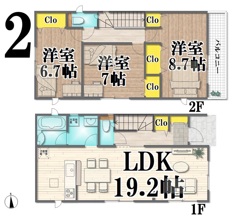 | 建物面積 | 96.38㎡・105.29㎡(29.15坪・31.85坪) | 土地面積 | 108.45㎡・117.14㎡(32.80坪・35.43坪) | ||