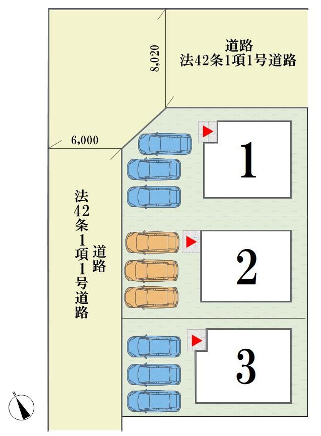 | 構造および階数 | 木造2階建 | 建ぺい率・容積率 | 建ペい率:1号棟60%⇒70%(角地緩和)、2.3号棟60% 容積率:200% | ||