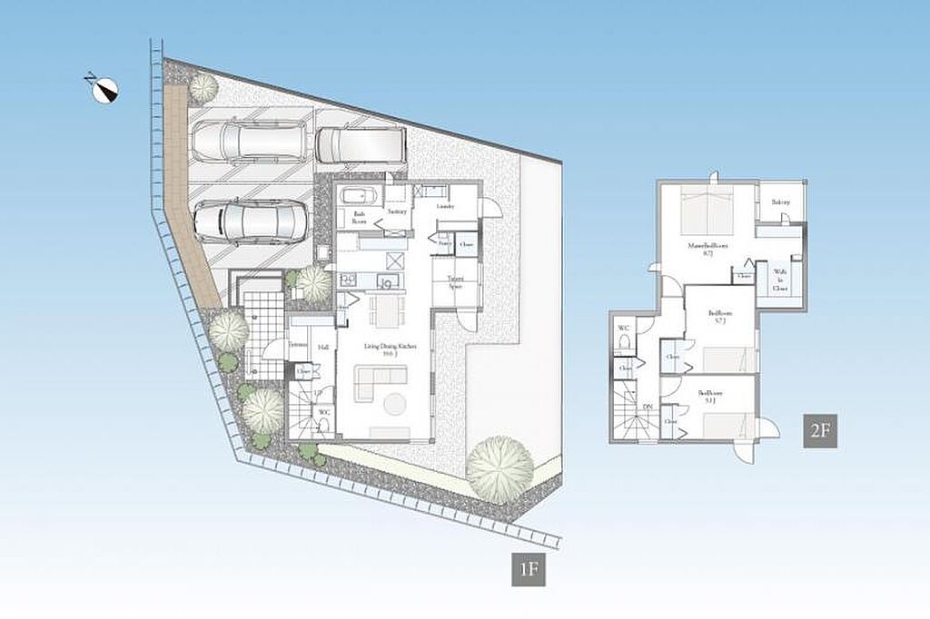 | 建物面積 | 91.22m2~104.71m2 | 土地面積 | 197.27m2~264.79m2<私道負担あり:191.00m2×持分1/20~191.00m2×持分1/20> | ||