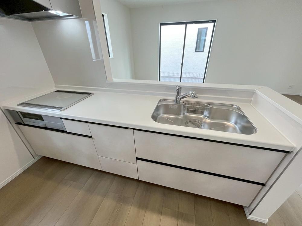 A号棟キッチンは対面式となっており、開放感かつリビングと一体感のある仕様でございます♪家族のコミュニケーションが絶えない、そんな空間を創り出していますね。調理スペースも広く使い勝手がいいです。
