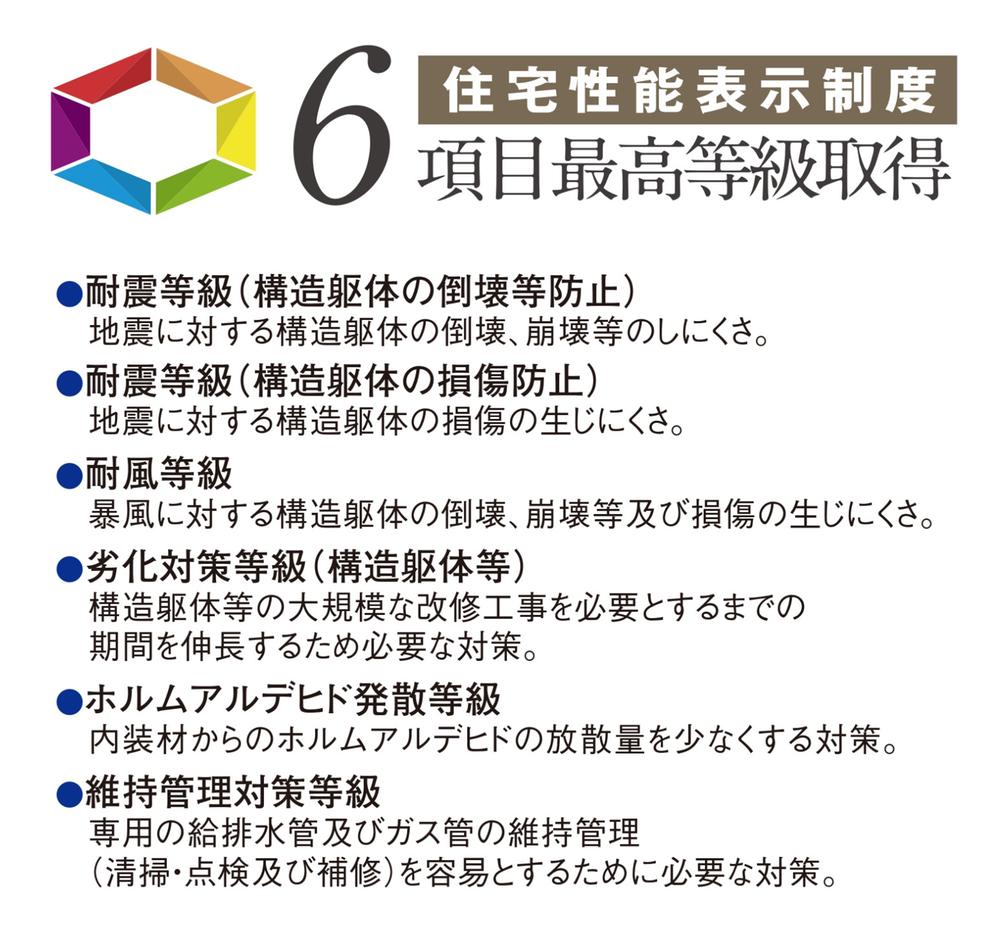 飯田産業の物件は住宅性能表示制度6項目で第三者機関による検査を経て最高等級を取得しています。◎耐震等級(倒壊しにくさ)◎耐震等級(損傷しにくさ)◎耐風等級◎劣化対策等級◎維持管理対策等級◎ホルムアルデヒド対策等級