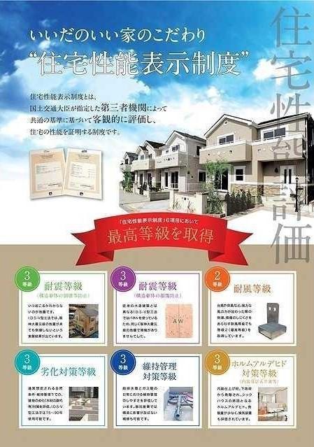 | 設備 | 設計住宅性能評価書 / 建設住宅性能評価書(新築時) / 省エネルギー対策 / フラット35Sに対応 / 地盤調査済 / 駐車2台可 / 省エネ給湯器 / システムキッチン / 浴室乾燥機 / 陽当り良好 / 全居室収納 / 閑静な住宅地 / LDK15畳以上 / シャワー付洗面化粧台 / 対面式キッチン / トイレ2ヶ所 / 浴室1坪以上 / 2階建 / 複層ガラス / オートバス / 温水洗浄便座 / 床下収納 / 浴室に窓 / TVモニタ付インターホン / 通風良好 / 全居室フローリング / 全居室複層ガラスか複層サッシ / 都市ガス / 浄水器 / 高機能トイレ | ||||