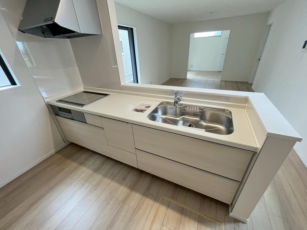 A号棟キッチンは対面式となっており、開放感かつリビングと一体感のある仕様でございます♪家族のコミュニケーションが絶えない、そんな空間を創り出していますね。調理スペースも広く使い勝手がいいです。
