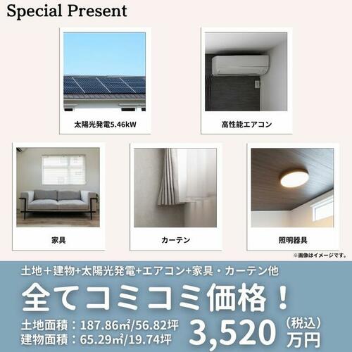 | 設備 | エアコン・給湯・収納スペース・追焚機能・フローリング・浴室乾燥機・Wクロゼット・照明器具・シャンプードレッサー・ウォシュレット・システムキッチン・カウンターキッチン・モニタ付インターホン・庭・クロゼット・IHクッキングヒータ・浄水器・食器洗浄乾燥機・複層ガラス・電気・上水道・下水道・太陽光発電システム・省エネ給湯器 | ||||