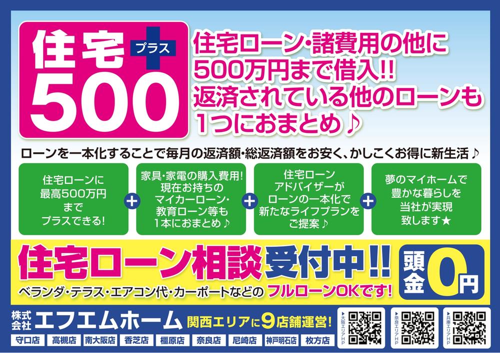 | モデルルーム情報 | 現地見学会(事前に必ず予約してください)日程/公開中時間/9:00~18:00▼▼『見学予約』『資料請求』『お電話』随時受付中▼▼◆◇◆地域密着で安心のサービス!◆◇◆エフエムホームは、奈良・香芝・橿原・高槻・枚方・守口・南大阪・尼崎・神戸明石の9店舗で、理想の住まい探しをサポート!「不動産購入は大きな決断だからこそ、信頼できる会社に任せたい」そんなお客様の想いに寄り添い、親身で丁寧な対応を心掛けています。◆◇◆家具・家電も住宅ローンに組み込み可能◆◇◆エアコン・カーテン・照明・家具・家電・カーポート・外構工事など、自己資金が必要なものも住宅ローンに組み込みOK!さらに引っ越し費用などもまとめられ、手元資金の負担を軽減。最適なローンプランをご提案し、新生活をスムーズにスタートできるようサポートします。◆◇◆ワンストップ対応のオプション工事◆◇◆住宅を購入しても「設備を追加したい」「ここをリフォームしたい」ということはよくあります。当社はリフォーム・リノベーションも手掛ける不動産のプロ!オプション工事もワンストップ対応で、理想の住まいに仕上げます。◆◇◆アットホームなスタッフが親身に対応◆◇◆「家を買うのは初めてで不安…」そんな方も安心♪経験豊富なスタッフが丁寧にサポートしますので、何でもご相談ください!◆◇◆無料の住宅ローン事前審査で安心!◆◇◆「気に入った物件があったのに、ローン審査に通らなかった…」そんな事態を防ぐため、無料の住宅ローン事前審査がオススメ!審査は簡単、最短1日で結果が出ます。提携金融機関との交渉で、審査通過の可能性もUP!まずはお気軽にお問い合わせください♪エフエムホームが夢のマイホーム実現を全力でサポートいたします!▼▼『見学予約』『資料請求』『お電話』随時受付中▼▼ | ||||