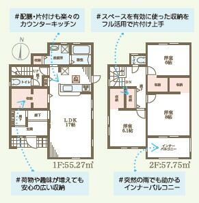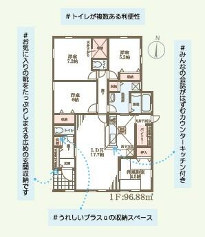 | 設備 | 収納スペース・追焚機能・浴室乾燥機・シャンプードレッサー・ウォシュレット・システムキッチン・カウンターキッチン・モニタ付インターホン・庭・クロゼット・トイレ2ヶ所・床下収納・ルーフバルコニー・IHクッキングヒータ・浄水器・カードキー・複層ガラス・電気・下水道 | ||||