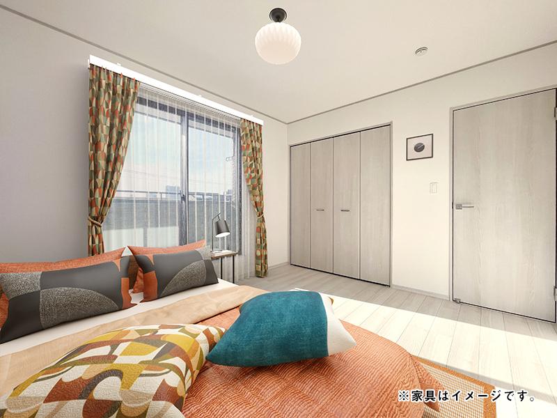 現地写真:主寝室(4号棟)※家具はイメージです。現地写真にテーブルやソファなどの家具をCGで配置しています。家具入りのお部屋をご覧いただくことで実際の暮らしを想像していただければと思います。