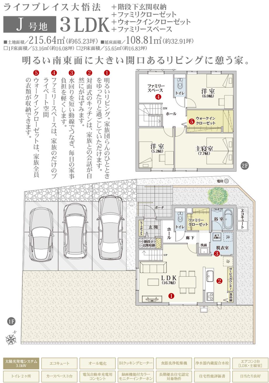 | 設備 | トイレ2ヶ所 / 2階建 / オール電化 / LDK15畳以上 / 庭 / システムキッチン / IHクッキングヒーター / 駐車3台以上可 / 整形地 / 閑静な住宅地 / 緑豊かな住宅地 / 太陽光発電システム / 即引渡可 / 平坦地 / 設計住宅性能評価書 / 土地50坪以上 / 長期優良住宅認定通知書 / ウォークインクローゼット / リビング階段 / 複層ガラス / 全居室フローリング / 年度内引渡可 | ||||