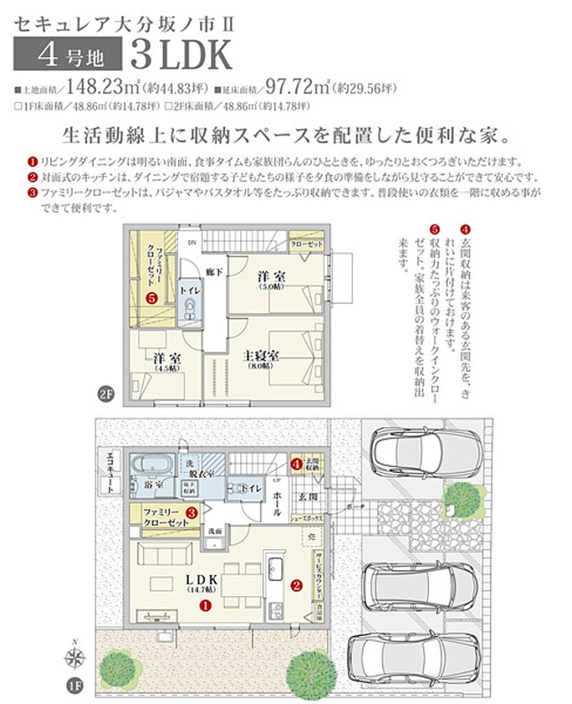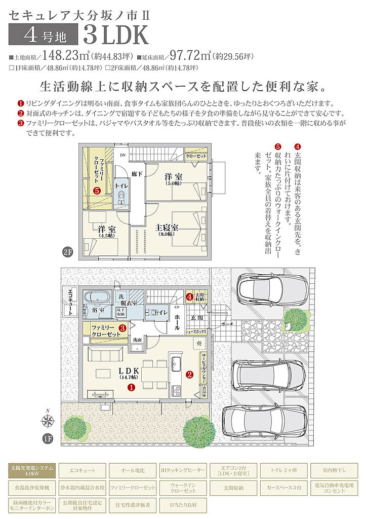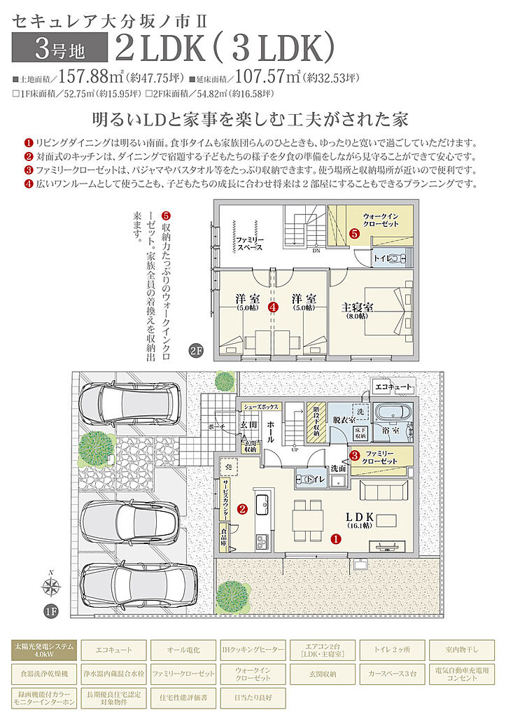 | 建物面積 | 107.57m2(3号地)、97.72m2(4号地) | 土地面積 | 157.88m2(3号地)、148.23m2(4号地) 全て私道負担なし | ||