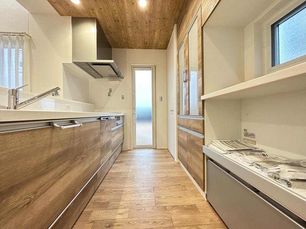 ③号地キッチンは横幅が2.55mあり作業スペースを広く取っております。食洗器や自動洗浄付きの換気扇もついており家事時間も低減できます。背面収納の奥にはパントリーもあるので収納上手に片付けれます