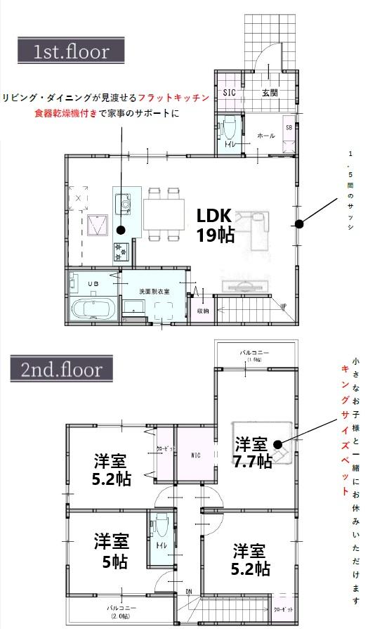 | 設備 | 駐車2台可 / LDK20畳以上 / システムキッチン / シャワー付洗面化粧台 / 対面式キッチン / トイレ2ヶ所 / 2階建 / 複層ガラス / 温水洗浄便座 / 床下収納 / ウォークインクローゼット / 全居室複層ガラスか複層サッシ / シューズインクローク / 平坦地 / 食器洗乾燥機 | ||||