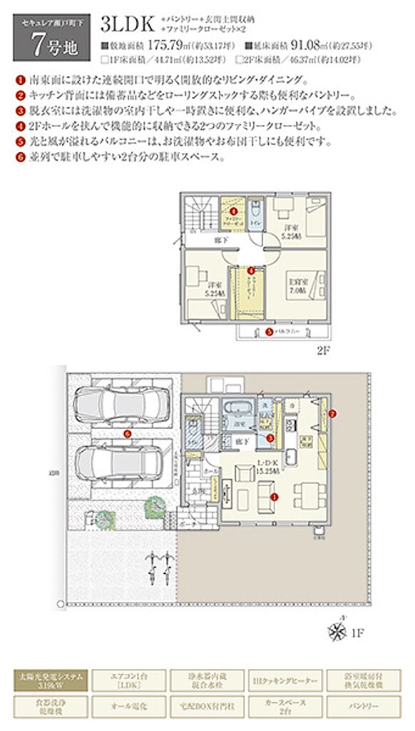 | 建物面積 | 91.08m2(6号地)、91.08m2(7号地) | 土地面積 | 175.78m2(6号地)、175.79m2(7号地) 全て私道負担なし | ||