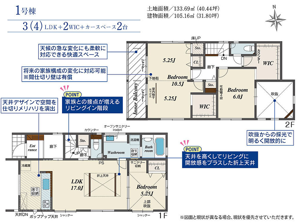 | 建物面積 | 105.16m2(約31.81坪)~111.92m2(約33.85坪) | 土地面積 | 133.69m2(約40.44坪)~135.83m2(約41.08坪) | ||