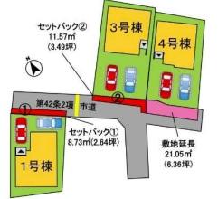 | 地目 | 宅地 | 道路付け | 道路幅:4m、アスファルト舗装、1号棟:セットバック要 8.73㎡ | ||